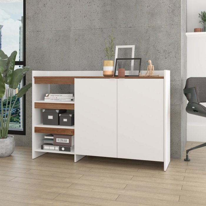 Balcão para Escritório 2 Portas 3 Nichos Office Brv Móveis Branco com castanho