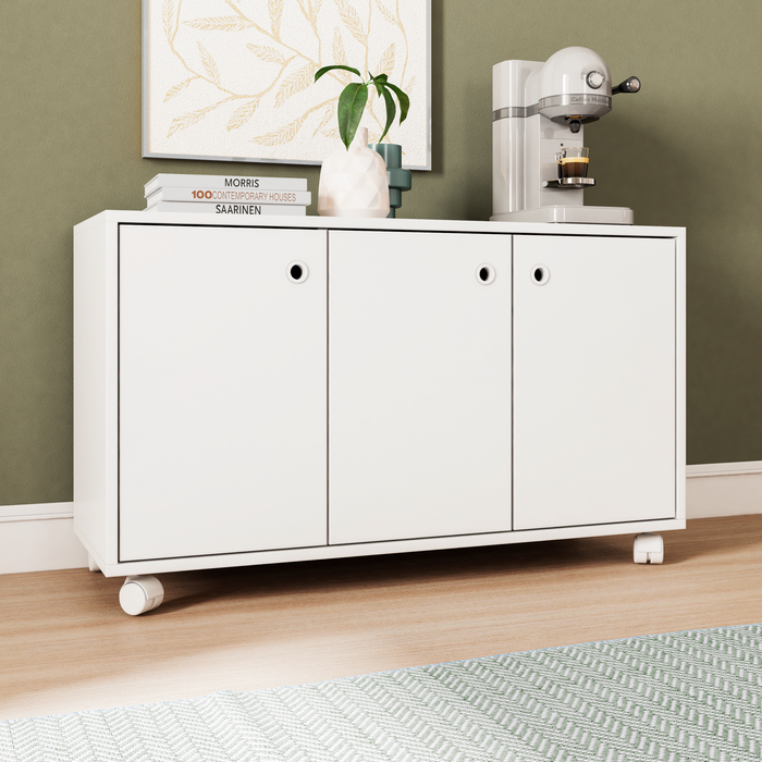 Balcão para Escritório Baixo Pequeno 3 Portas com Rodízio Bho 25 Branco