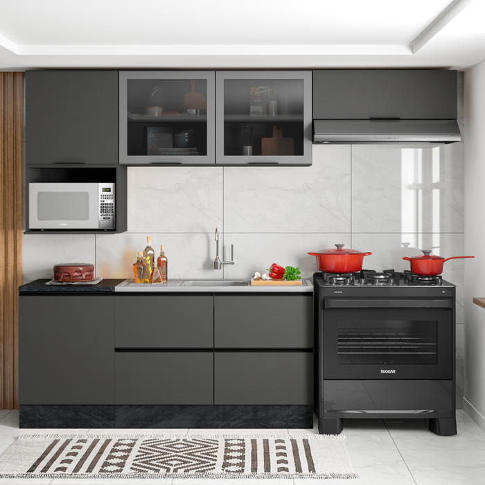 | Informações Complementares (Novo) | Balcão para pia (sem tampo), portas basculantes com pistão a gás, dobradiças resistentes de 35mm com a função slow motion, gavetas com corrediças telescópicas, pés PVC reguláveis, rodapés removíveis com presilhas modelo click. |