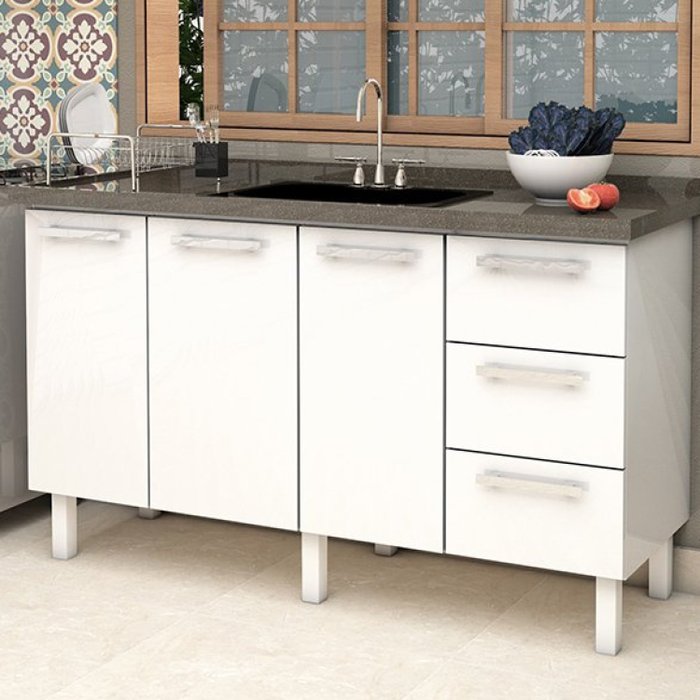 Balcão para Pia de Cozinha 150cm 3 Portas 3 Gavetas Vênus Branco