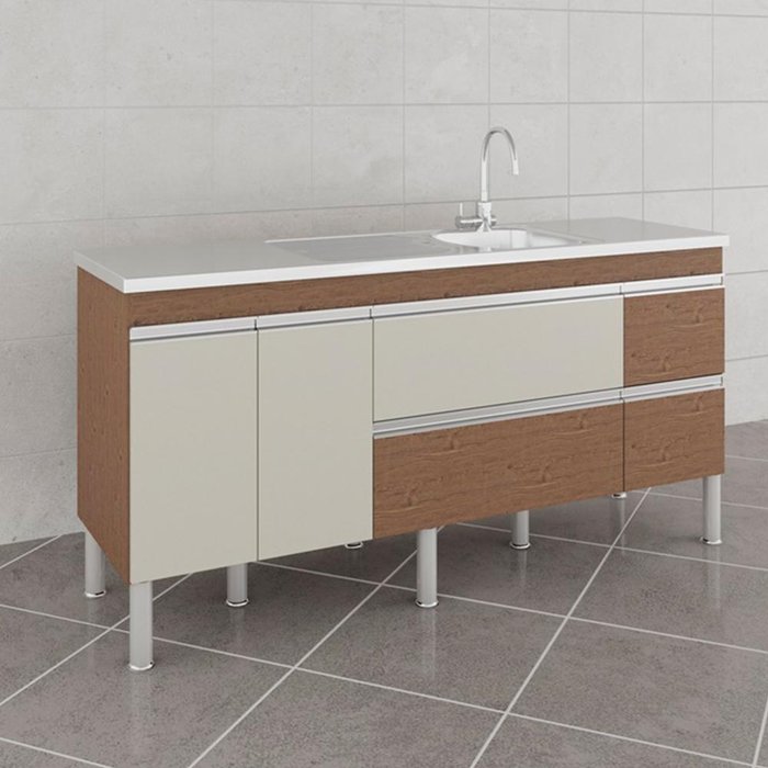 Além disso, ele tem um padrão moderno e espaçoso contendo uma porta, duas gavetas com corrediças telescópicas espaçosas, uma com divisor de talheres e um gavetão, puxadores em perfil alumínio.Especificações:Altura: 86 cm