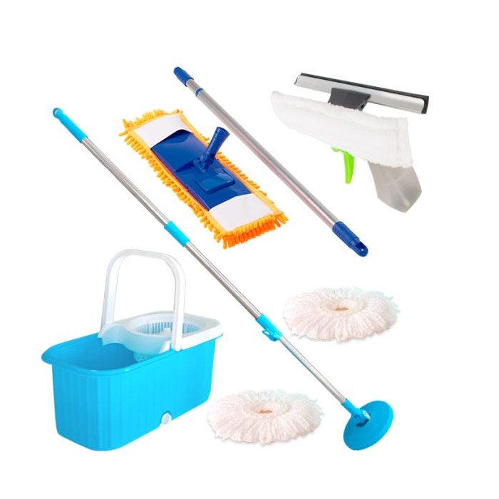 Balde Mop Esfregão C Rodinhas+ Rodo limpa vidro+ Mop Tira Pó Azul