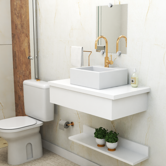 Bancada Armário Gabinete Suspenso para Banheiro Cuba Mármore Sintético Quadrado Com Espelho e Pratel Branco