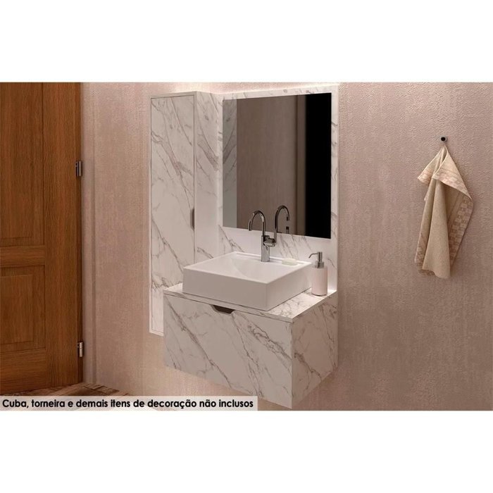 Conjunto de Banheiro Balcão Suspenso c/ Cuba 90cm e Espelho BN3604 Mármore Branco - Tecno Mobili