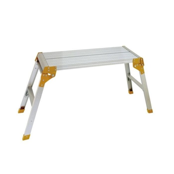 Pode ser utilizado como bancada, mesa ou andaime para auxiliar em todas as tarefas domésticas e profissionais pois pode acomodar caixa de ferramentas, lata de tintas, ferramentas manuais entre outros objetos de uso diário. Altamente resistente, suporta até 150 kg. Estrutura em alumínio naval com elegantes cantoneiras de aço pintadas de amarelo e pés antiderrapantes para maior estabilidade.