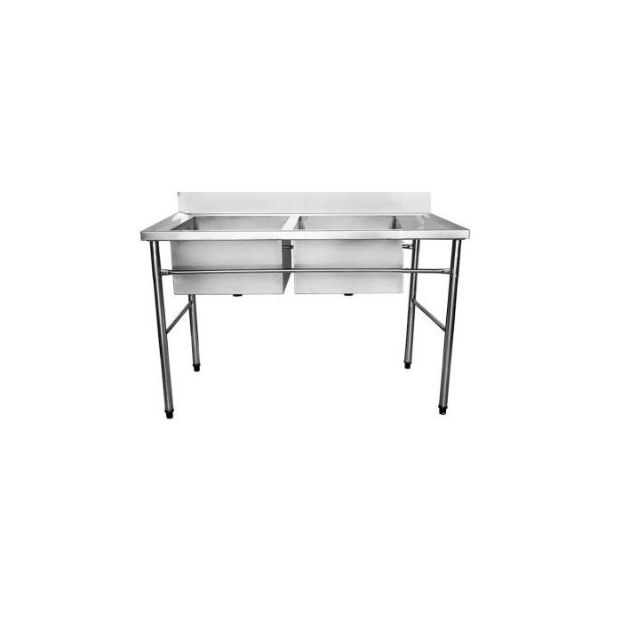 Bancada / Mesa de Aço Inox com dois tanques/pias para diversas aplicações com 1,6 metro(s), produzida totalmente em Aço Inoxidável de pura qualidade e suporta até 300 Kg distribuídos. Trabalhamos com Aço Inox 201 que é muito superior ao Aço 430. Após a confirmação do pedido, entraremos em contato para confirmar o lado da pia e verificar se há a necessidade de furação para torneira. Enviamos com pés reguláveis para trazer maior estabilidade e todas as ferramentas necessárias para montar a bancada. A melhor opção para uso em cozinhas, restaurantes, padarias, açougues, laboratórios e indústrias de diversos setores. Medida(cm): 160 (comprimento) x 70 (largura) x 85 (altura) Medida pia/tanque(cm): 56 (comprimento) x 34 (largura) x 14 (profundidade) Imagens meramente ilustrativas.