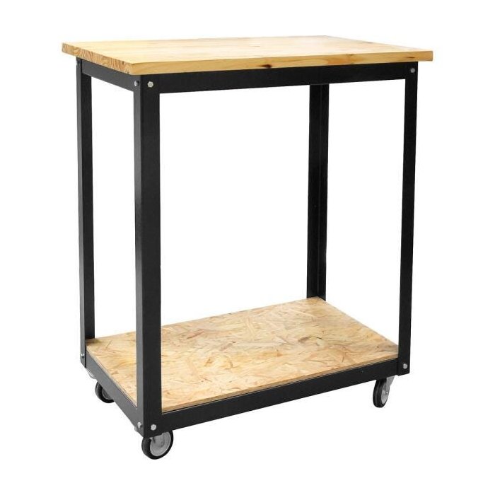 Possui estrutura em aço com tratamento anticorrosivo e pintura eletrostática a pó, com tampo de 25 mm em madeira de pinus fingada e envernizada, e prateleira inferior em OSB. Permite a fixação de uma gaveta, vendida separadamente, de forma que os itens necessários estejam sempre à mão. Conta com 4 rodízios de 3'', que permitem o deslocamento necessário ao trabalho.