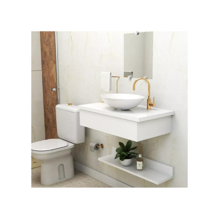 Pensando na comodidade dos nossos clientes, entregamos o produto montado. Basta instalá-lo em seu banheiro e ele estará pronto para uso. Não há necessidade de perder tempo e energia com montagens complexas. Além disso, a bancada acompanha uma prateleira que pode ser posicionada abaixo dela, oferecendo espaço adicional para a organização dos seus itens de higiene pessoal, tornando a experiência no banheiro ainda mais funcional e organizada.