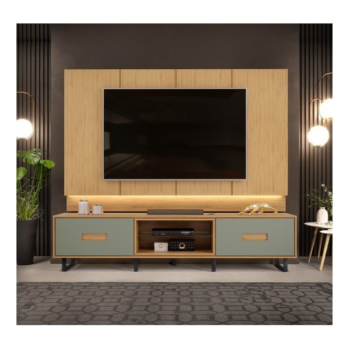 Bancada Rack com Painel 240cm com LED para TV até 75 Polegadas 2 Gavetas Madri Alecrim/Carvalho Natu