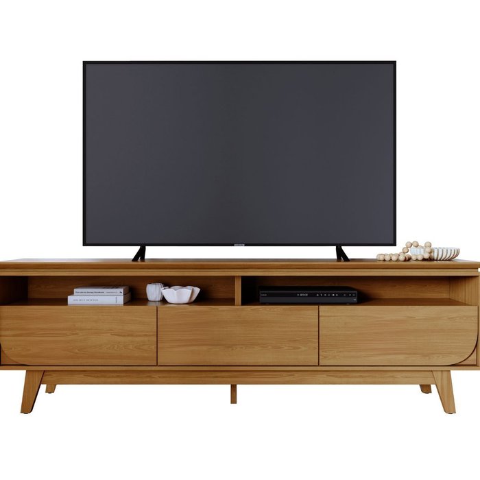Bancada Selene elegante e funcional, ideal para compor a sua sala com sofisticação e praticidade. Conta com três gavetas espaçosas equipadas com corrediças telescópicas, garantindo abertura suave e total aproveitamento do espaço interno. As gavetas laterais possuem um charmoso detalhe curvo, agregando um toque diferenciado ao design. O tampo suspenso de 25mm com borda chanfrada proporciona um visual moderno e robusto, conferindo destaque ao ambiente. Seus pés usinados oferecem estabilidade e sofisticação, complementando a estrutura composta por painéis em MDP de 15 e 25mm, que garantem resistência e durabilidade. Desenvolvida para acomodar TVs de até 75", esta bancada une estilo e funcionalidade, sendo uma excelente escolha para quem busca um móvel de alta qualidade e design diferenciado.