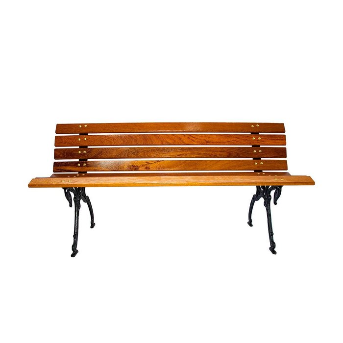 Pés em ferro fundido com pintura em esmalte sintético e parafusos galvanizados para fixação das ripas.