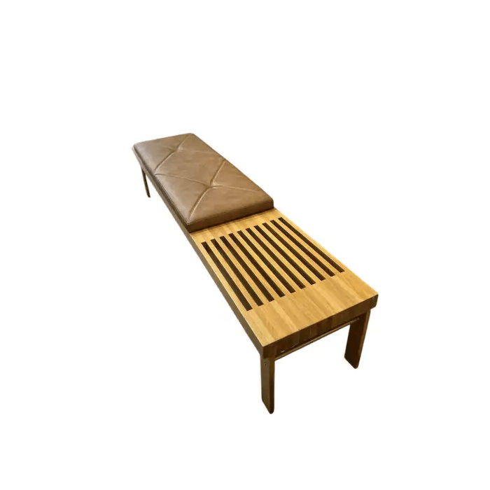 O assento acolchoado proporciona um lugar confortável para sentar, enquanto a superfície de ripas é ideal para exibir objetos ou descansar itens do dia a dia. É o equilíbrio perfeito entre conforto e praticidade.