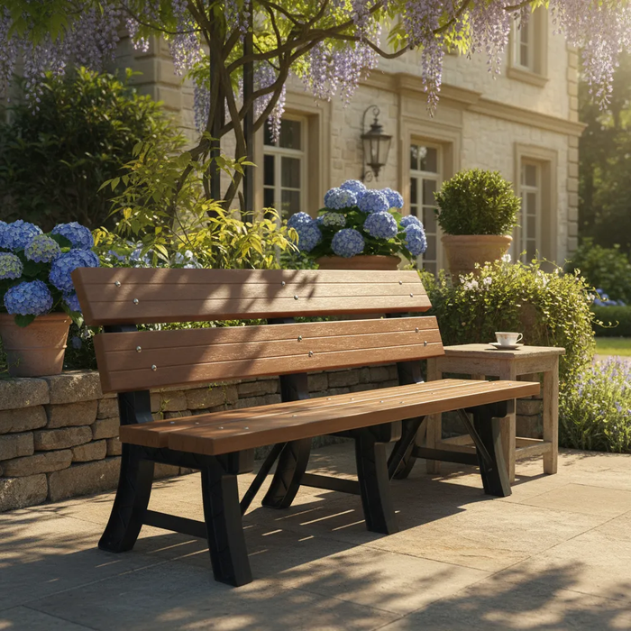 banco de jardim, banco com encosto, banco madeira plástica, banco para área externa, banco ecológico, mobiliário externo, banco resistente, banco para varanda, banco sustentável