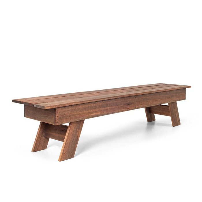 O banco é construído em madeira maciça de eucalipto, o acabamento Rústico é feito com STAIN na tonalidade Nogueira. Esse tipo de acabamento não forma filme, permitindo que a madeira trabalhe de acordo com as condições climáticas, além de possuir proteção UV e hidrorepelente.