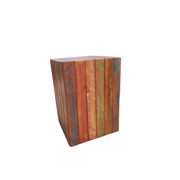 Banco quadrado ripado produzido em madeira de demolição mista com acabamento em pátina colorida e cera de carnaúba.