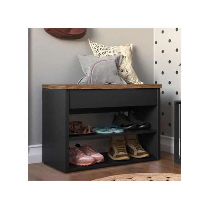 Banco Sapateira Hall 2em1 com Prateleira:Preto Freijó Preto Freijó