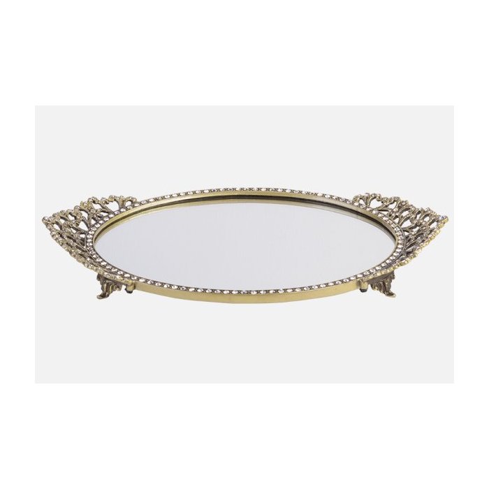 Bandeja oval em metal dourado com espelho e aplicação de pedrarias. Cor: Dourado Material: Metal Dados do produto Garantia: 0(dias) Marca: Manu Fisch Home NCM: 83062900 EAN: 7898597795927 Dados de Embalagem Peso Total (Produto + Embalagem): 531.00(gr) Altura: 1.50(cm) Largura: 14.50(cm) Profundidade: 26.00(cm) Itens Inclusos