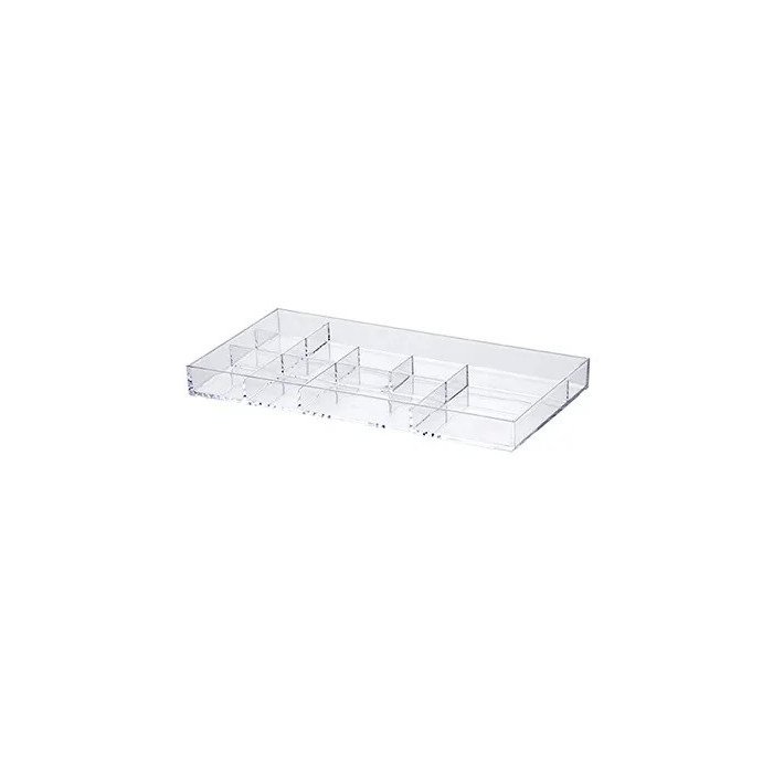 Bandeja com divisórias transparente Ideal para organizar seus acessórios de forma prática e rápida. Contém divisórias internas para melhor organização Transparente para melhor visualização do conteúdo Material: Poliestileno Dimensões: 34x17x3 cm