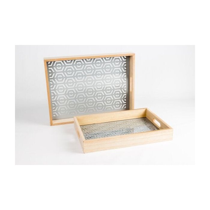 Kit com duas bandejas, em madeira maciça (Pinus Elliottii). Possui fundo de vidro com desenhos geométricos vazados.Dimensões: Pequena: 35 x 25 cm | Peso: 800g Grande: 40 x 30 cm | Peso: 1 Kg Limpeza: Pano levemente umedecido com água, seguido de pano seco.Cuidados: Não utilizar produtos químicos ou abrasivos na limpeza. Evitar batidas e contato com objetos cortantes.
