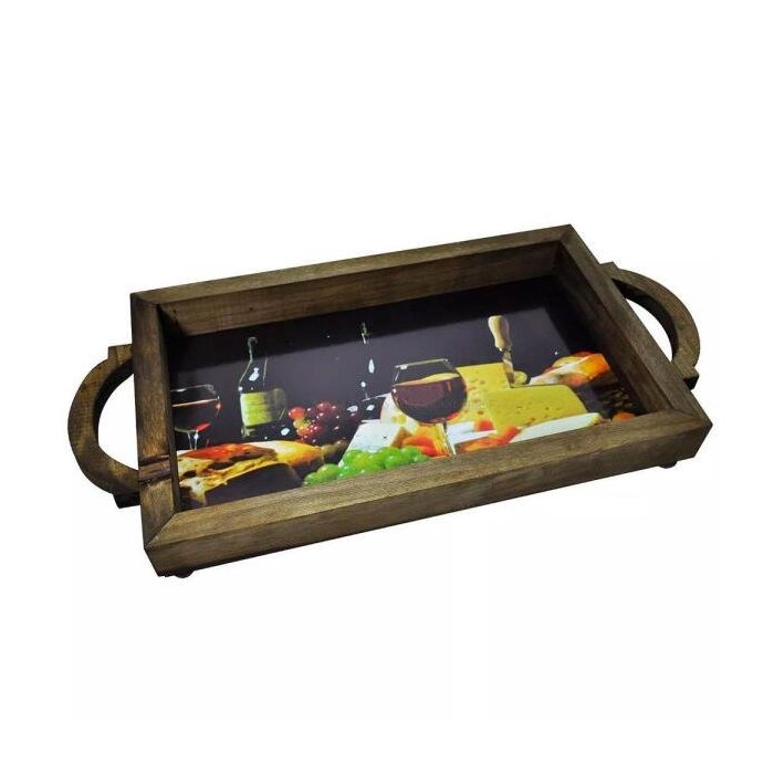 Bandeja em madeira suporte bebidas e café decorativa - vinhos e queijos Bandeja grande em madeira com alça para decorar seu barzinho e/ou cantinho do café - suporte de bebidas Bandeja com alça rústica no tamanho 50x25x6 em madeira pinus decorada, peça decorativa repleta de detalhes e perfeita para decorar e/ou presentar, com desenhos em impressão digital. Produto em madeira pinus, desenvolvida de forma artesanal, com ótimo acabamento e pronto para utilização. Use em sua casa, chalé, cantinho do café, cafeteria, cantinho de bebidas, barzinhos e muito mais. Deixe a sua criatividade fluir e misture cores, formas e tamanhos em um só lugar, além de ser uma ótima opção para presentear. Dimensões: Comprimento: 50 cm Largura: 25 cm Altura: 6 cm Peso em gramas: 1050 g Características do produto: - bandeja em madeira pinus com alça rústica; - produzido por artesões profissionais seguindo um padrão de qualidade que atenda o gosto dos nossos clientes Garantia do produto: - o produto é muito bem acomodado dentro da caixa, e super embalado para evitar quebras, ainda assim possuímos um sistema de garantia e troca. Imagens meramente ilustrativas – produto artesanal, podendo variar de cor e/ou tonalidade
