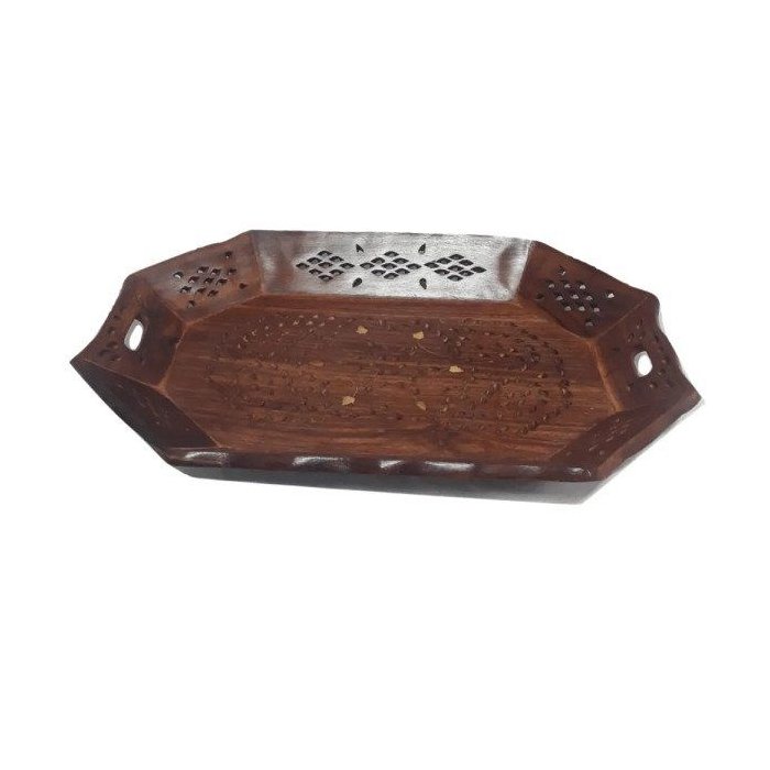 Bandeja Entalhada em Madeira Suar Medidas: 39 cm de comprimento, 25cm de largura, 7 cm de altura Produto artesanal, feito na Índia