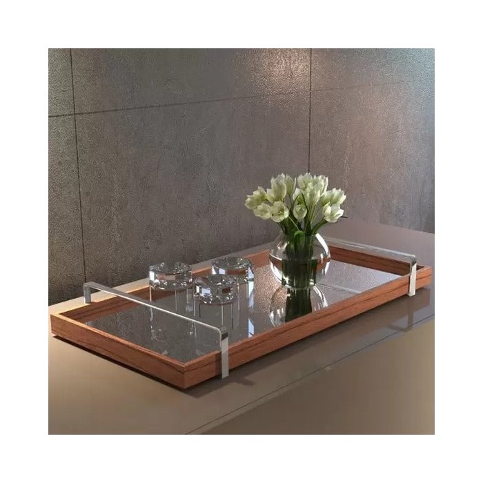 Bandeja Espelhada Decorativa Madeira com Alça e Espelhada:natural Cinamomo/cromado