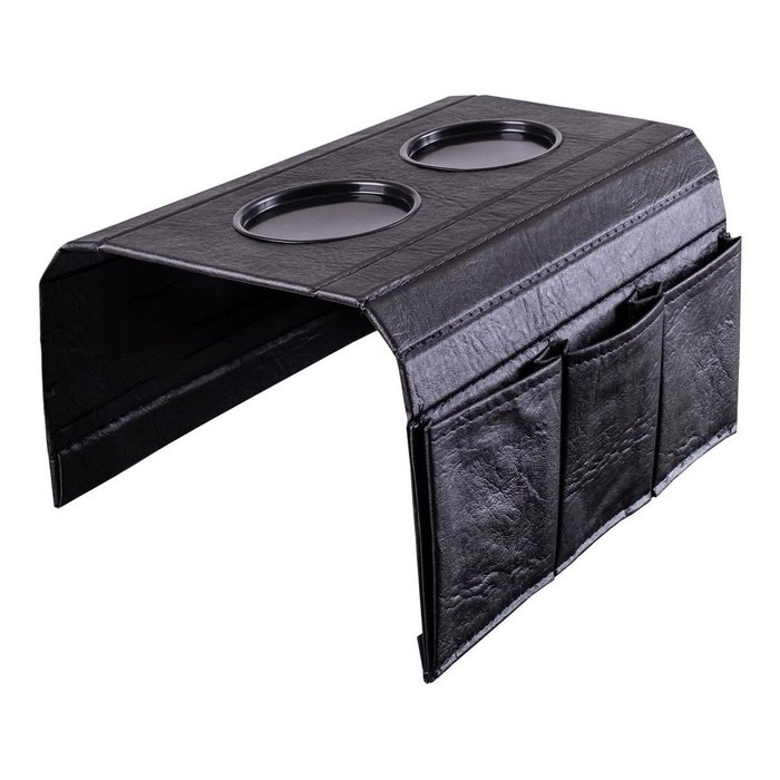 Bandeja Esteira para Braço de Sofá de Couro Preto com Porta Controle.
