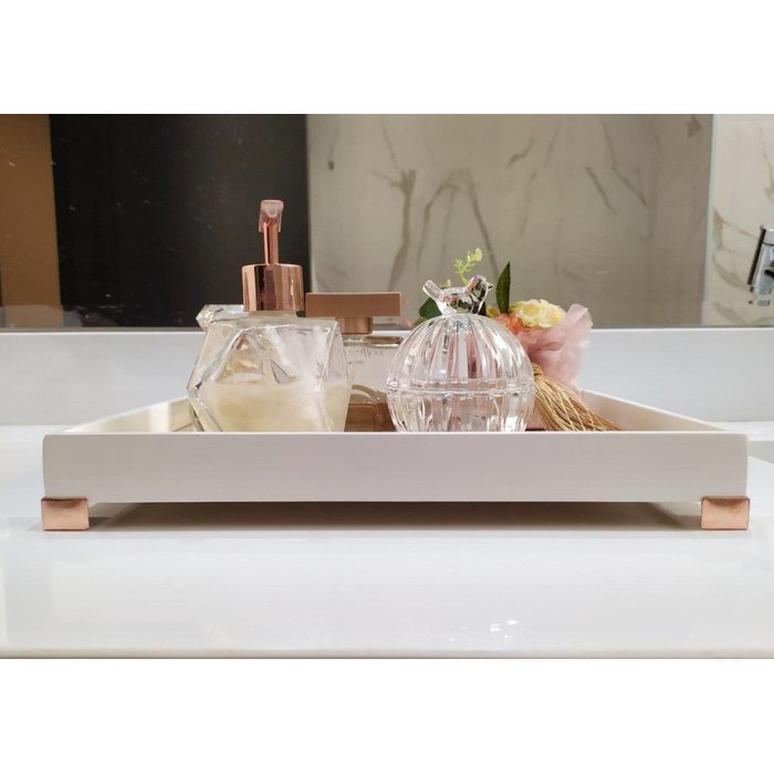 Bandeja Lavabo Banheiro Cozinha Difusor Mdf Pé Rosê Bronze Branco