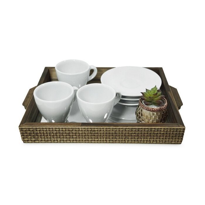 Bandeja Madeira Média Pinus para Bebidas Copos e Sala CARACTERÍSTICAS ESPECIAIS: A bandeja é produzida em madeira de pinus tratado, de alta qualidade e espelho resistente na base. O pinus tratado é um material muito resistente, fazendo com que a bandeja fique ainda mais reforçada, além de proporcionar um acabamento maravilhoso e exclusivo Base espelhada e puxadores em madeira. MEDIDAS EXTERNAS: 36 x 25,5 x 4,5cm (Comprimento x Largura x Altura) MEDIDAS INTERNAS: 29 x 23 x 3,3cm (Comprimento x Largura x Altura) SUGESTÃO DE USO: Podem ser usadas tanto para servir bebidas (para copos, taças, xícaras, etc), como pequenos pratos, comidas gourmet, dentre outras). Podem ser usadas também como bandejas para kits aromatizantes (frascos) e saboneteiras (frascos para sabonetes líquidos). Ou mesmo para suporte de vasinhos e outros objetos a gosto! OBS.: O anúncio é referente SOMENTE a bandeja, demais itens ilustrativos.