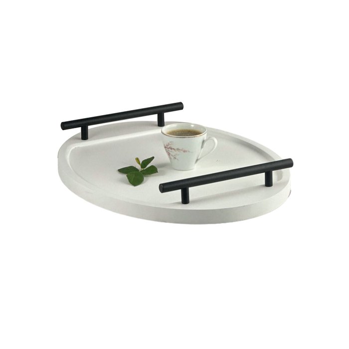 Com alças de aço que acrescentam um toque de modernidade, a bandeja é fácil de manusear e transportar, garantindo estilo e segurança em todos os momentos. O acabamento, com pintura refinada e verniz fosco, proporciona uma textura suave e um visual elegante, destacando a sofisticação da peça.