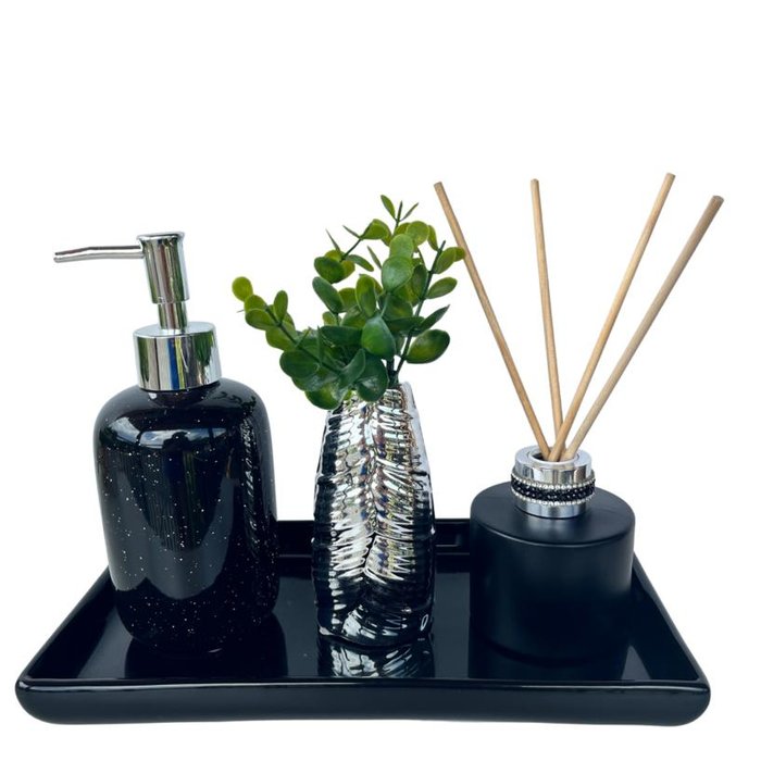 Decoração banheiro lavabo bandeja retangular de cerâmica com pintura alto brilho moderna decor + difusor de vidro preto fosco redondo com detalhe pedrarias + vaso de cerâmica estilo estampa folha prata prateado moderno + porta sabonete líquido preto de cerâmica estampa granilite com válvula de plástico prateado.