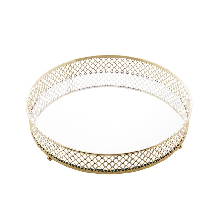 Bandeja redonda de metal dourado com espelho 20 cm DESCRIÇÃO Medidas: 20 x 5 cm Material: Metal e espelho