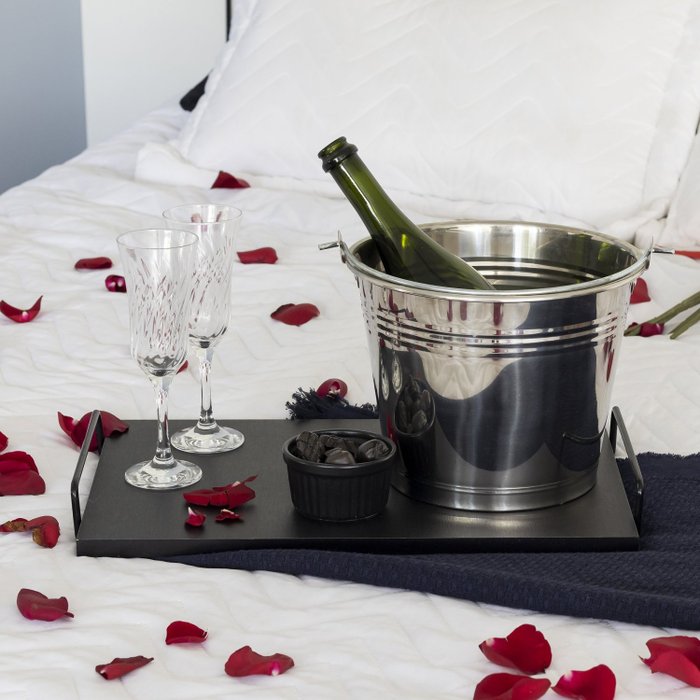 Bandeja grande multiuso decorativa com lateral em aço e madeira MDP ideal para decorar e organizar a sala de estar, sala de jantar e outros ambientes usada para juntar perfumes e frascos ou acomodar um delicioso café