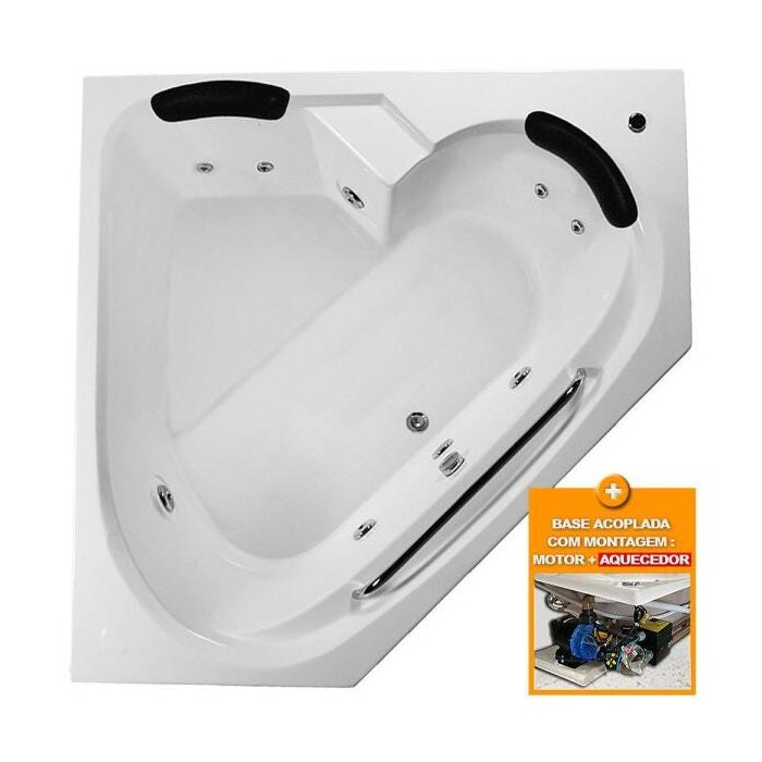 Banheira de Hidromassagem Canto Alpha Dupla 1,54x1,54x0,49 Acrilico-Completa+Base Acoplada+Aquecedor As Banheiras de Hidromassagem LINEAPLAS SOBANHEIRAS, são produzidas em Fibra de Vidro com acabamento em Acrilico, um material de alta durabilidade, longa vida útil e um brilho sem igual. Este material proporciona grande conforto aos seus usuários. É extremamente fácil de limpar e oferece resistência a raios ultravioletas e a ação do tempo. Os dispositivos de hidromassagem são fabricados em ABS com acabamento cromado. A garantia é de 1(um) ano no casco e 1(um) ano nos acessórios.Banheira Com Hidro Completa Acompanha- 4 Jatos direcionáveis e reguláveis;- 4 Mini Jatos (Nas Costas);- 1 Alça;- 2 Encosto de Cabeça (Travesseiros);- 1 Entrada de água;- 1 Saída de água;- 1 Sucção;- 6 Entrada de ar (Arejador);- Tubulação de água e ar;- 1 MotoBomba de 1 cv auto-drenante;- 1 Aquecedor de passagem digital com controle de temperatura;- 1 Base Acoplada para Motor;Banheira Com Hidro Completa Não Acompanha- Suporte Nivelador;- Cromoterapia;- Diferença para Motobomba Silenciosa;- Tampa de Inspeção;FUNÇÃO DO AQUECEDOR E BASE ACOPLADAAquecedor: É produzido sob um rígido padrão de qualidade. Seu novo sistema de aquecimento contém a mais avançada tecnologia para sua segurança e conforto. Maior aquecimento em menor tempo. Compacto, auto-drenante,fonte com transformador que isola e baixa a tensão para 5 volts no comando digital, evitando a possibilidade de choque ao usuário. Fiação de entrada de energia emborrachada que suporta até 130º. A fixação do painel de Comando pode ser feita na borda ou parede. Tem a função de ligar o motobomba, aquecer e manter a temperatura da água. Base Acoplada: Na compra da Base Acoplada a banheira já sai da fabrica com todos os acessórios adquiridos na compra instalados e testados. Entraremos em contato com o cliente após a compra, para que nos informe a posição que deseja a instalação da base.