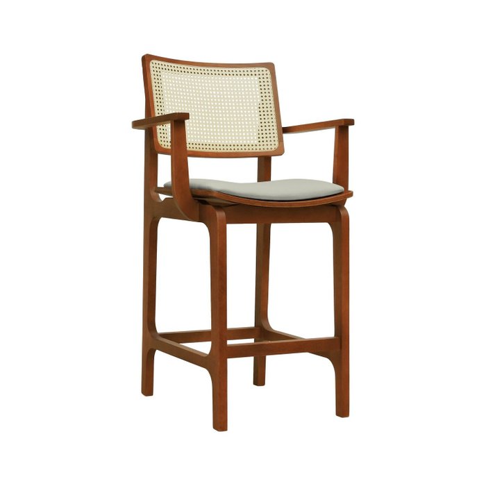Banqueta Alta Bistrô Gus com Braços Madeira Maciça Encosto Telinha Assento Anatômico Linho