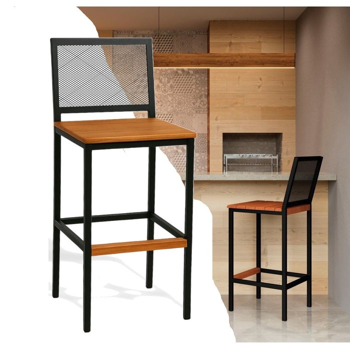 Banqueta Alta com Encosto Aço Preto e Assento Madeira Demolição para Cozinha, Ilha ou Área Gourmet