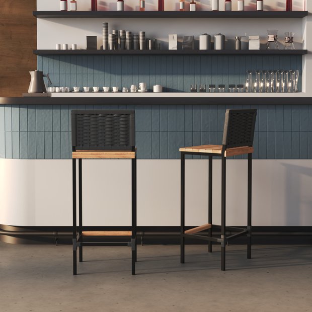 Banqueta Alta em Aço com Assento de Madeira Maciça Encosto de Junco Preto PRETO