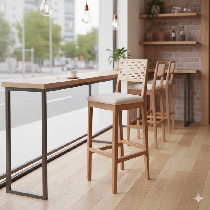 Banqueta Alta em Madeira Maciça Linho bege, Ratam amarelo e madeira mel