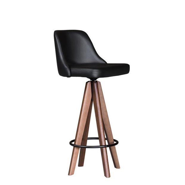 Banqueta alta produzida com concha interna em compensado e espuma de alta densidade, revestida em material sintético na cor preta. Base giratória em madeira com detalhes em ferro pintado.