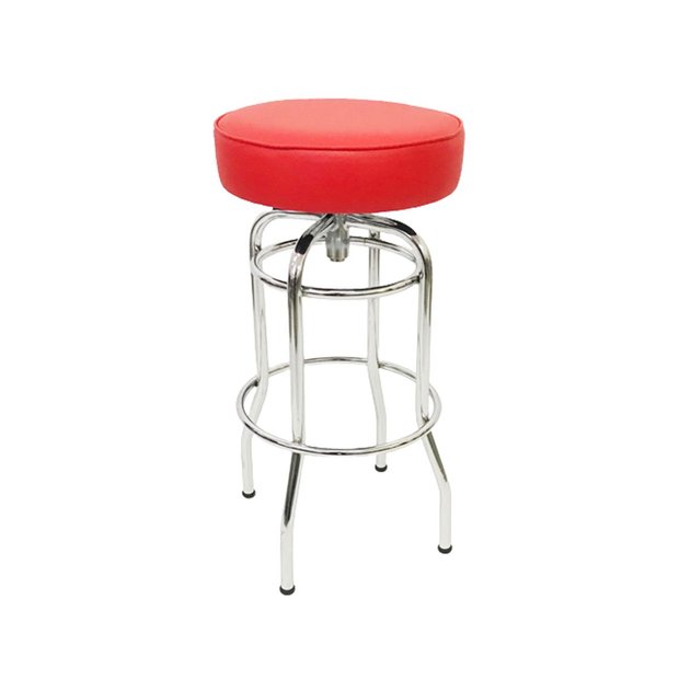 - Nossa banqueta tem sua estrutura produzida em aço carbono tubo 7/8 e na argola para apoio dos pés o tubo utilizado é o 3/4. É revestida com cromagem de alta qualidade e possui assento com diâmetro de 36cm que é produzido em madeira de MDF engrossurado + espuma de 2,5cm com densidade D18 + revestimento em material sintético na cor vermelho, totalizando a grossura total do assento de 9cm (entre madeira, espuma e tecido).