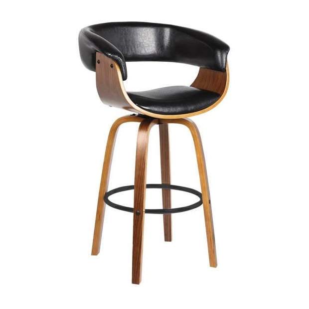 Estrutura : Banqueta giratória em madeira compensada (nogueira), com assento revestido em PU e base em madeira, com apóia pés em aço pintado.