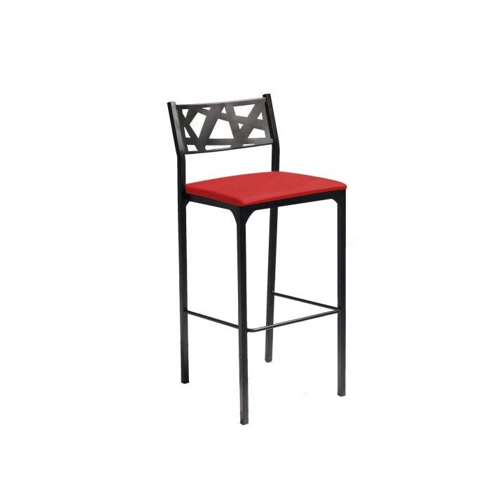 Banqueta de cozinha estrutura em aço acabamento com pintura epóxi preta, encosto em chapa de aço cortada em laser, assento em aglomerado revestido em espuma d14 e corino, utilizada em bancada de cozinha, bares e áreas de lazer.