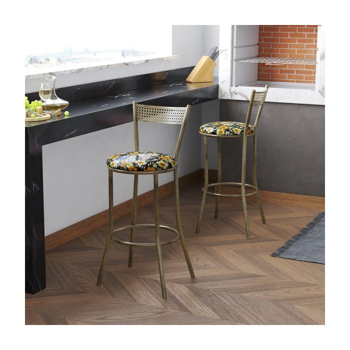 Banqueta Dourada Em Aço Sofia Floral Hibisco Amarelo Dourado Envelhecido