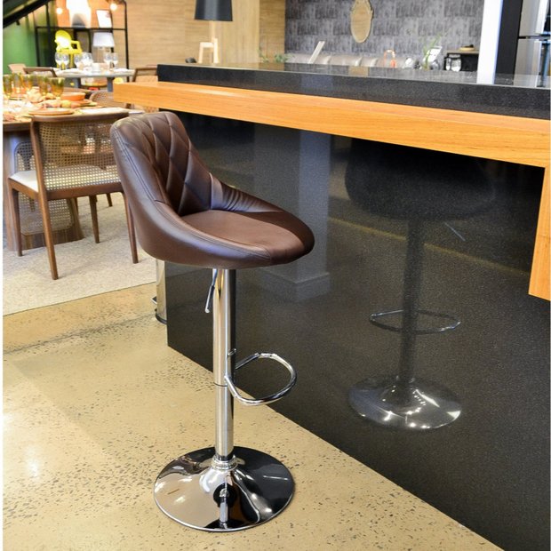Banqueta para utilização em ambiente interno, giratória com dispositivo de ajuste de altura (altura regulável 84cm até 105cm) e base em aço cromado em formato de disco (38cm). Possui assento e encosto em espuma revestida em tecido poliuretano (pu), sem br