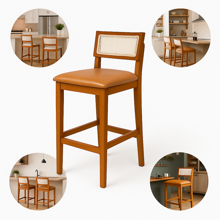 Banqueta de Madeira Maciça com Assento em Couro e Encosto em Tela Sextavada — Conforto, Elegância e Durabilidade para o Seu Ambiente