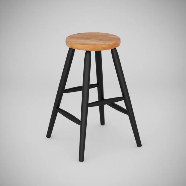Altura: 60 cm | Largura: 41 cm | Profundidade: 41 cm | Diâmetro do assento: 30 cm. Material: Madeira maciça (eucalipto reflorestado). Peso: 3 kg (cada unidade). Peso suportado: até 100 kg. Cor: Verniz Preto e Natural Premium (PU atóxico). *As tonalidades podem variar levemente conforme a iluminação e o padrão natural da madeira.