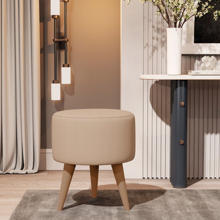 Banqueta Redonda Suede Areia Puff Estofado Pé Palito Resistente Puf Decorativo