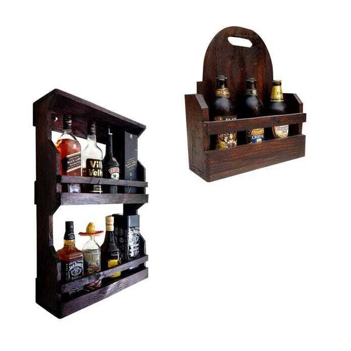 | Itens Inclusos | Bar de Parede Art Madeira Rústico 8 Garrafas 2 Andares + Cesta Artesanal Porta Bebidas 3 Garrafas |