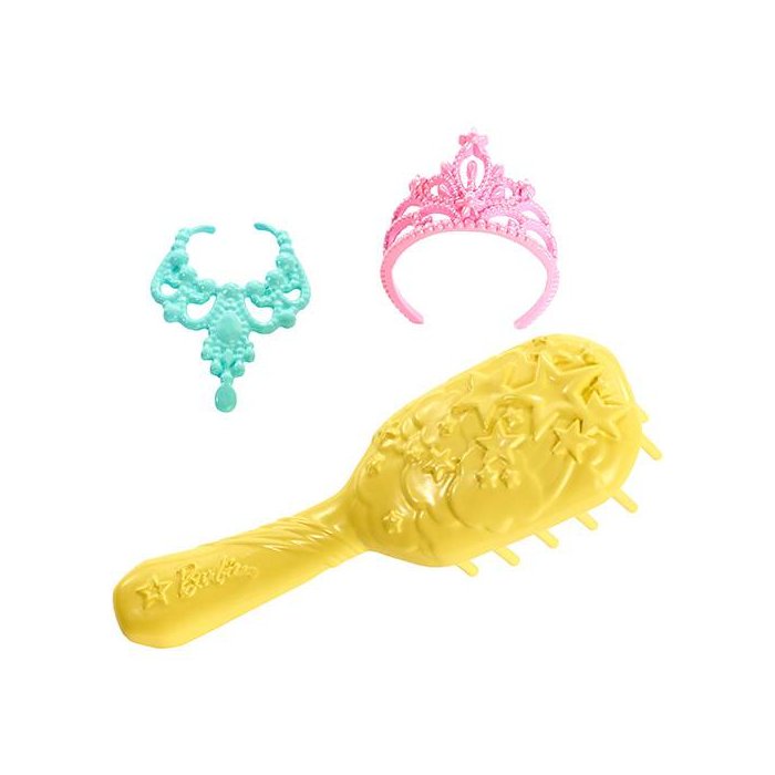 Ajude a Barbie a adicionar os acessórios certos para sua próxima ocasião real. Ela vem com duas tiaras, dois colares e uma varinha com ponta de estrela! Escove o cabelo riscado de rosa com a escova de cabelo incluída e chegue ao baile real com estilo.