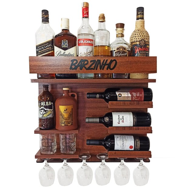 Suas bebidas agora bem mais visíveis e organizadas com o nosso BARZINHO de PAREDE.Peça em MDF Bilaminado que torna a peça Especial, pois seus veios imitam muito bem a Madeira Natural.E pra completar, ocupando pouquíssimo espaço em seu ambiente, você consegue organizar suas bebidas e taças.Capacidade Aproximada para 6 Garrafas + 4 Copos ou garrafas pequenas + 6 Taças + 3 Garrafas de VinhoMDF com espessura de 15mm, o que torna a peça bem firme e visualmente muito Bonita.Além de decorar muito bem qualquer ambiente, ele também pode ser um ÓTIMO PRESENTE.Principais Características:• Feito 100% em Mdf 15mm Bilaminado• Capacidade Aproximada para 6 Garrafas + 4 Copos + 6 Taças + 3 Garrafas de Vinho• Dimensões: 54cm de largura x 51cm de altura x 13cm de profundidadeAcompanha parafusos e buchas para fixação.Indicações de Uso:PUB’sHome BarVarandas e Sacadas com temática GourmetCozinhasSalas em GeralChurrasqueirasObs: Imagem Meramente Ilustrativa, Copos, Garrafas e Demais Acessórios Não Acompanham o Produto